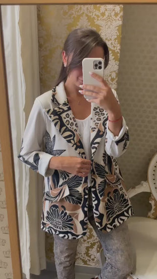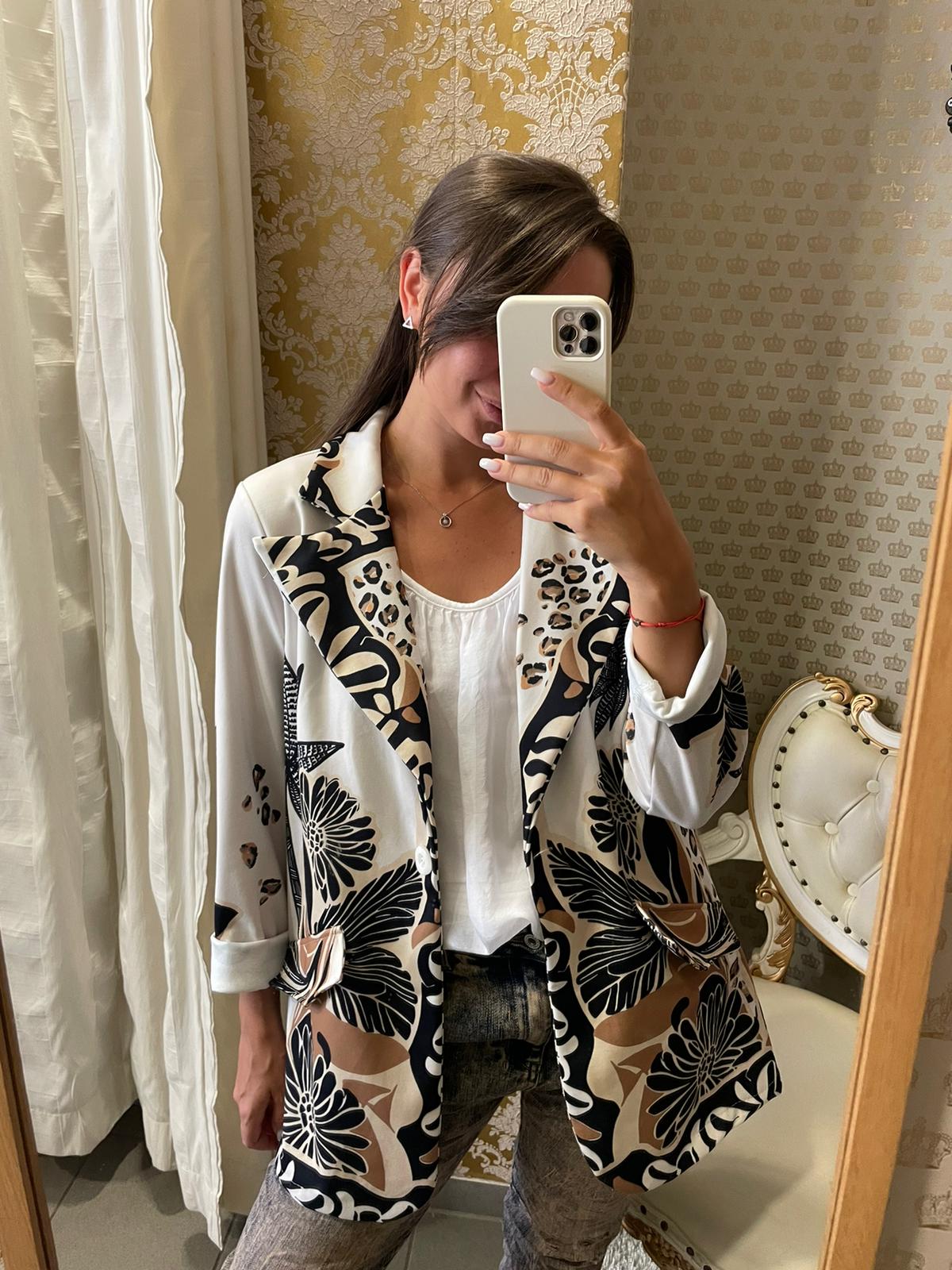 Muster und Stil: Der Blazer hat ein einzigartiges Muster mit einer Kombination aus Leopardenmuster und militärischen Tarnflecken. Auf dem Blazer befinden sich verschiedene Aufnäher mit unterschiedlichen Designs und Schriftarten. Die Farben umfassen Grün, Braun, Beige und Schwarz.