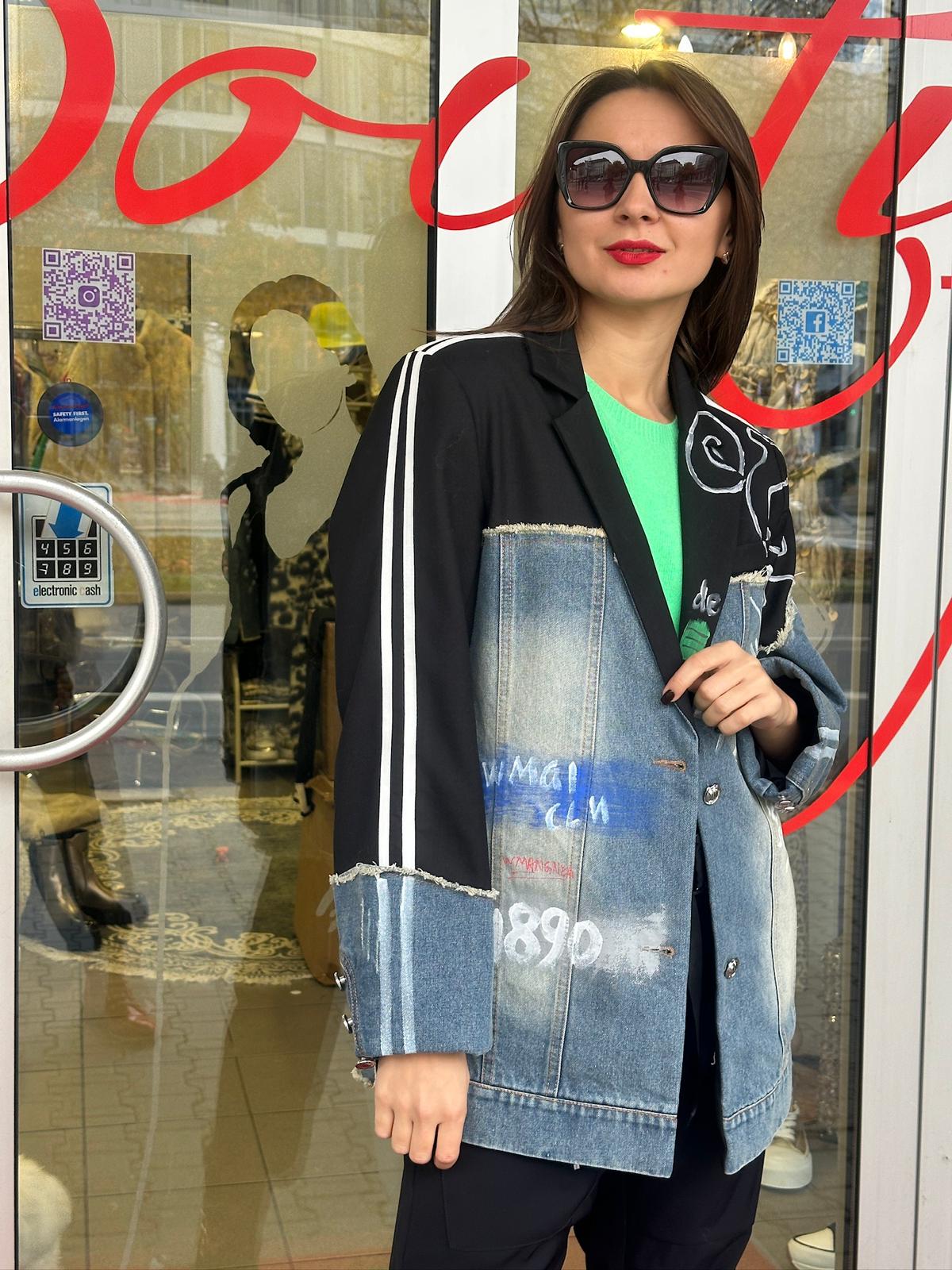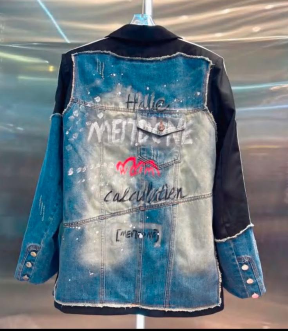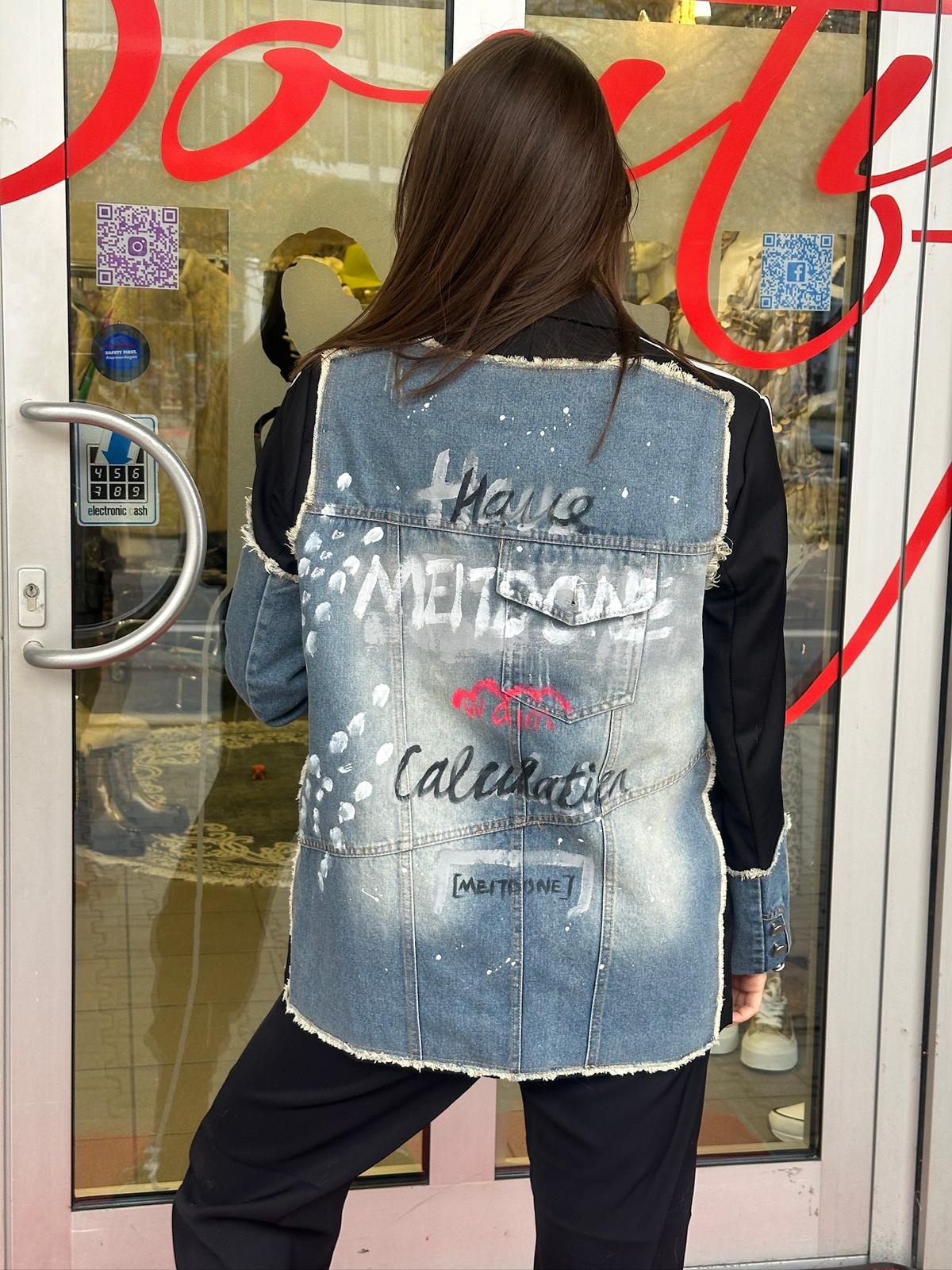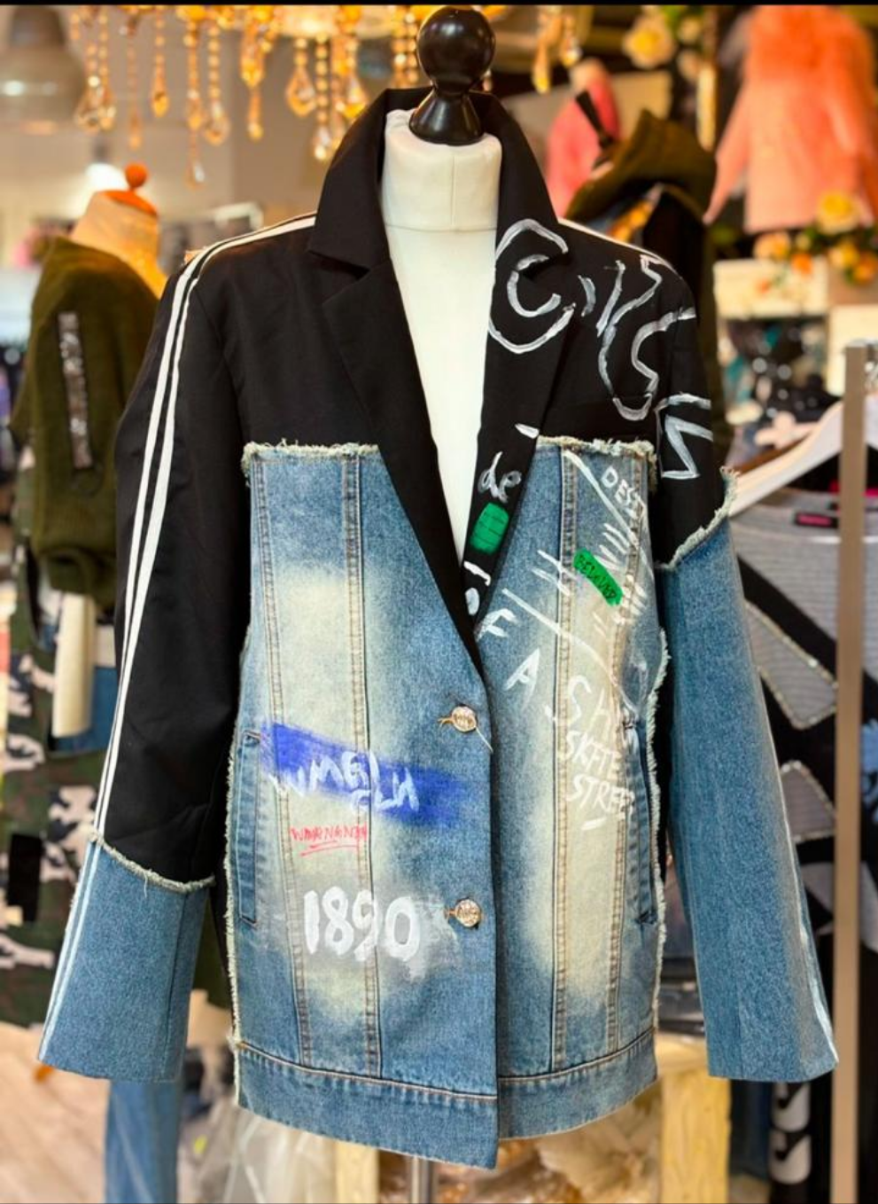 Auf der Denim-Fläche sind Schriftzüge und Zahlen (wie "1890") aufgedruckt, die dem Blazer einen künstlerischen und urbanen Look verleihen.