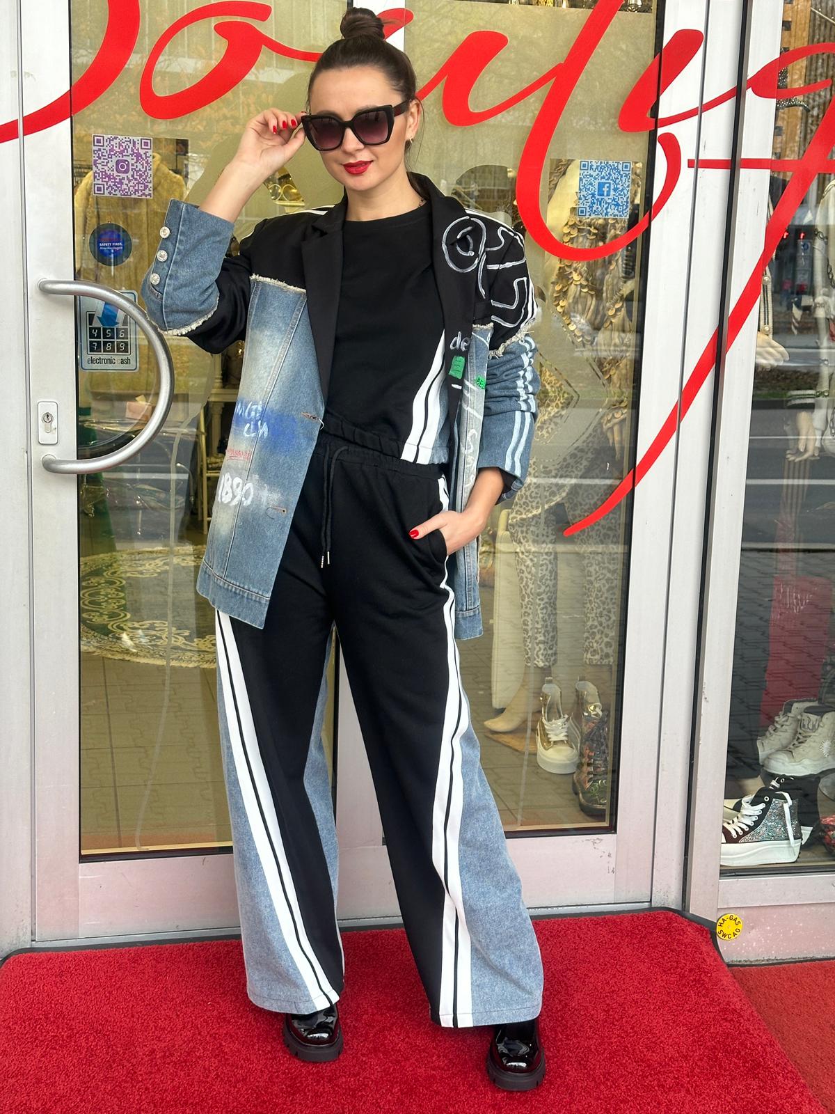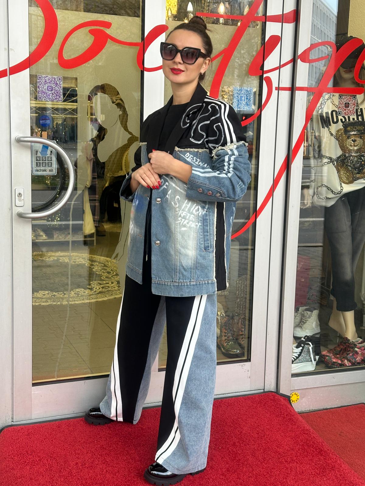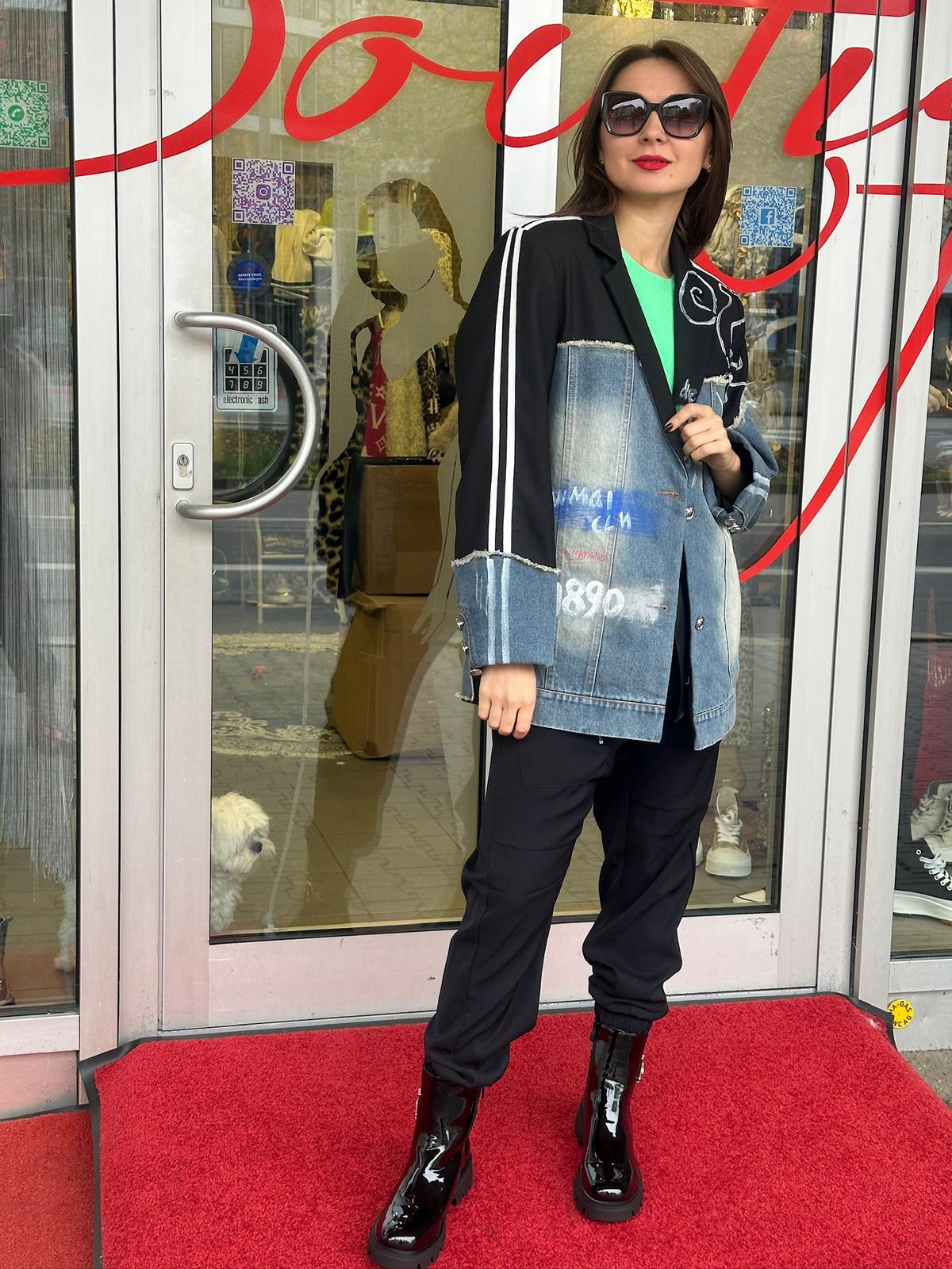 1. Materialmix: Der Blazer integriert Denim im unteren Bereich, während der obere Teil aus einem schwarzen Stoff besteht. Dies schafft einen spannenden Kontrast.