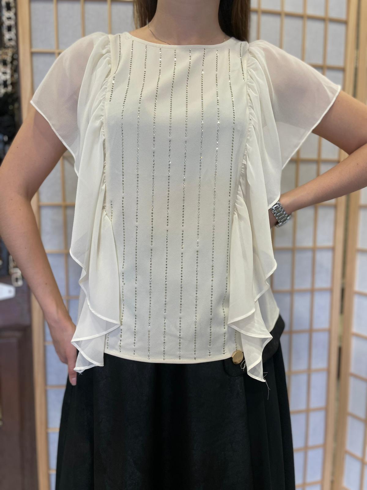 Dekorative Details: Vertikale Linien aus feinen Perlenverzierungen verleihen der Bluse einen eleganten Glanz.