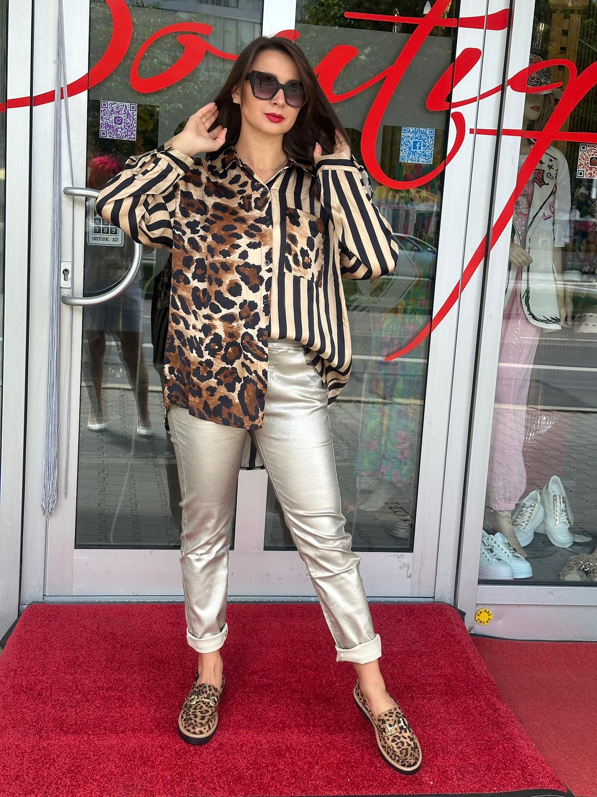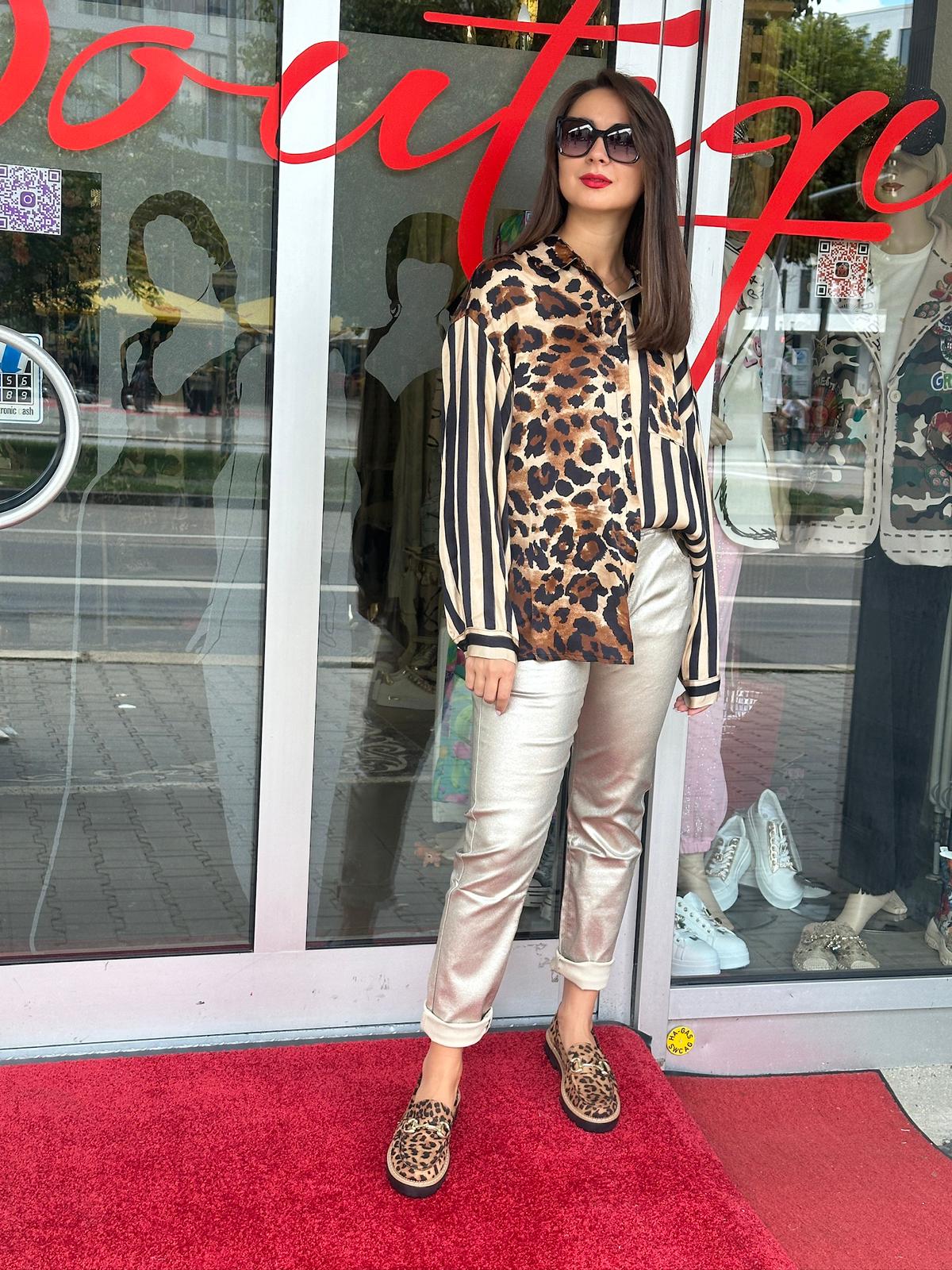 Diese auffällige Bluse ist ein echtes Fashion-Statement! Das einzigartige, asymmetrische Design kombiniert ein wildes Leopardenmuster mit klassischen Streifen und verleiht jedem Outfit einen modernen und edgy Look. Der glänzende Stoff sorgt für einen luxuriösen Touch, während der Hemdkragen und die lockere Passform für einen lässigen Chic sorgen.