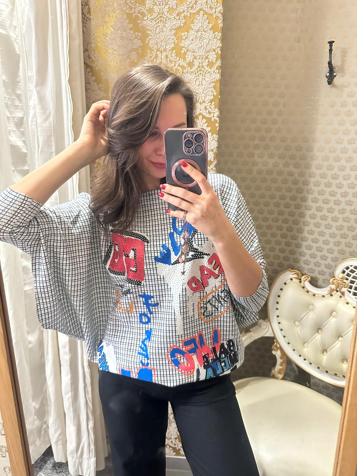 Diese Missy-Bluse ist ein echtes Statement-Piece, das durch ihren einzigartigen, künstlerischen Look besticht. Die lockere Passform und das angenehme Material sorgen für hohen Tragekomfort, während die auffälligen Prints und Designs die Blicke auf sich ziehen.