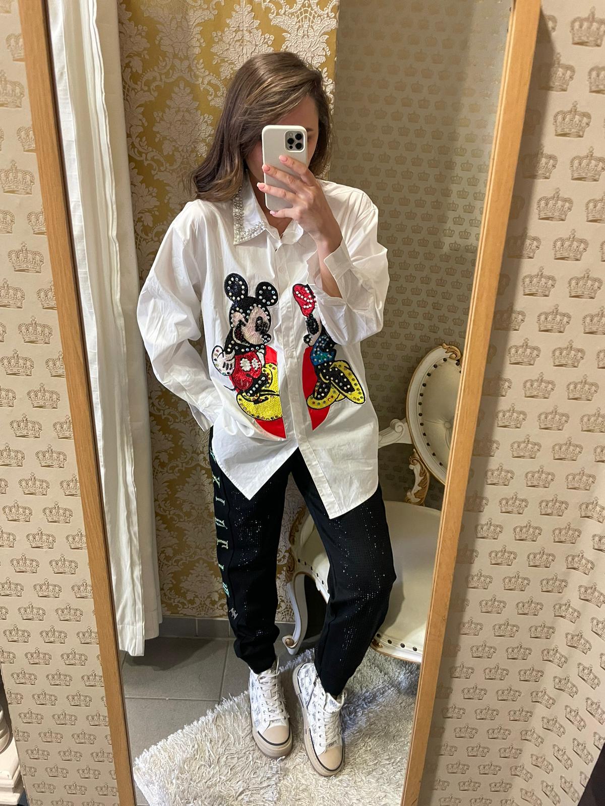 Die farbenfrohen Motive entlang der Knopfleiste verleihen der klassischen Hemdbluse einen verspielten Touch. Die Strasssteine am Kragen sorgen für einen zusätzlichen Hingucker. Die lockere Passform und das angenehme Material machen sie zu einem bequemen und stylischen Begleiter für den Alltag.