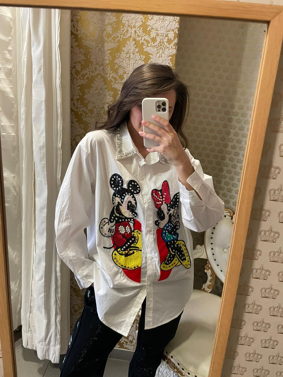 Details: Hemdkragen mit Strasssteinen, Knopfleiste mit Cartoon-Motiven, lange Ärmel, lockere Passform