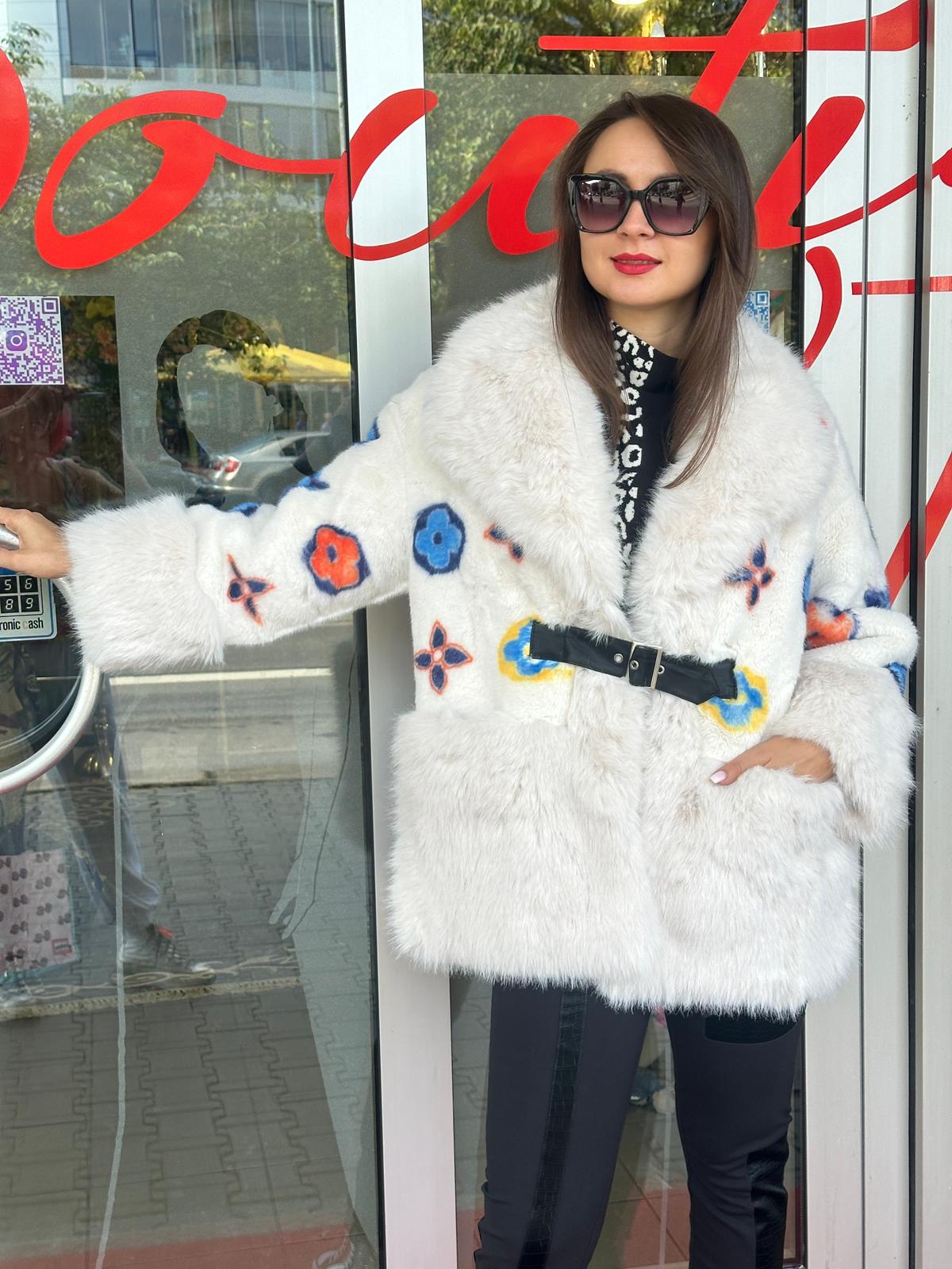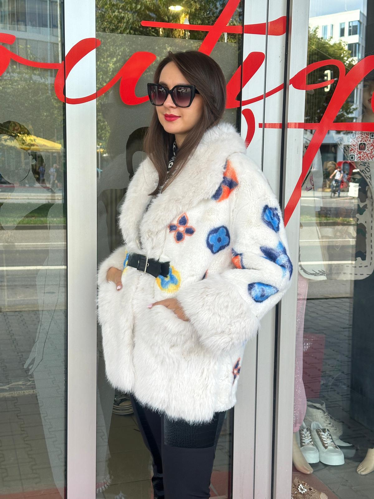 Hochwertige Kunstfelljacke in Weiß mit buntem, floralem Muster.