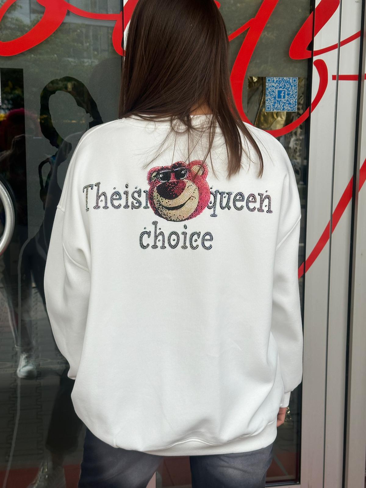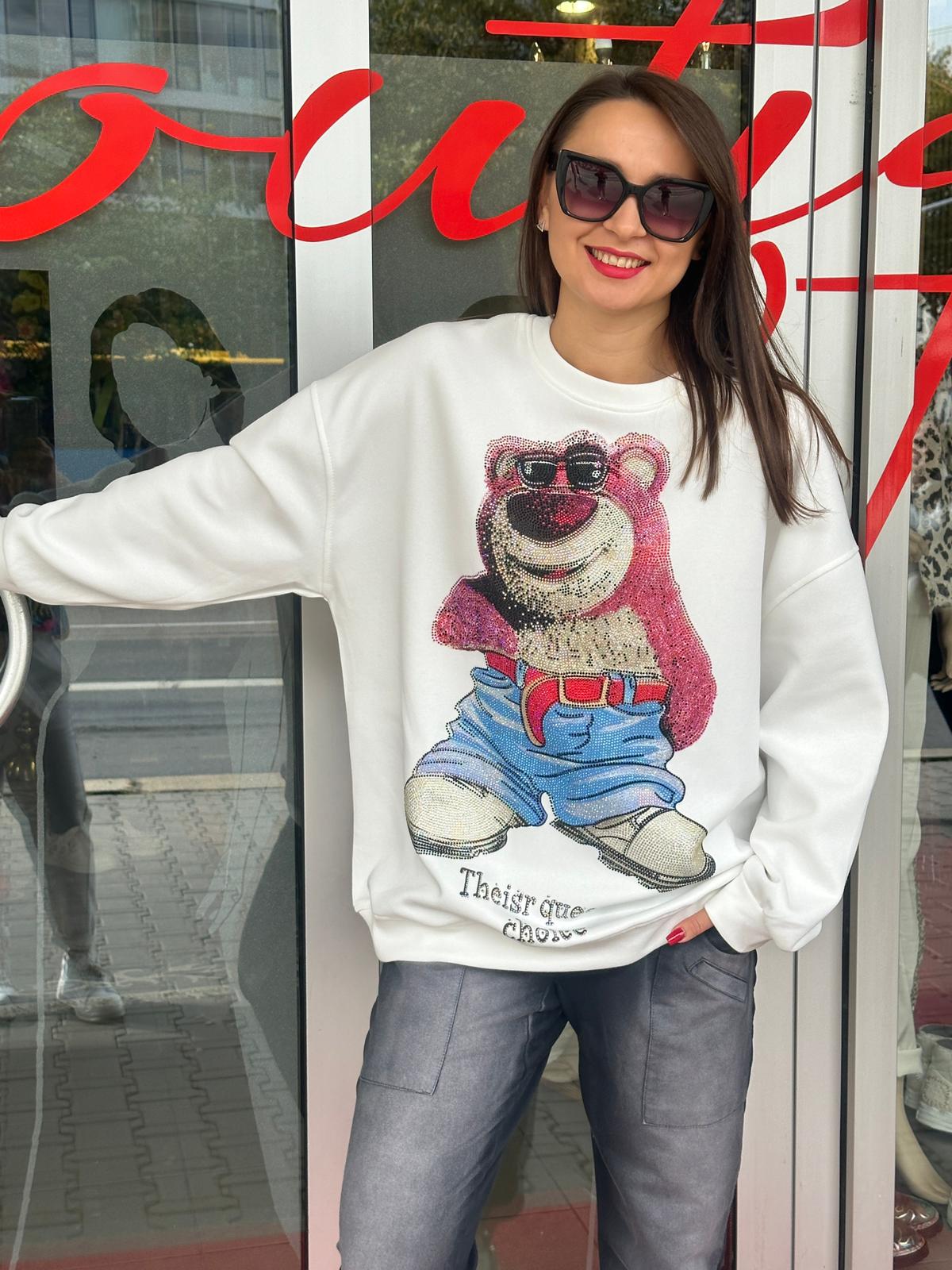 Das auf dem Bild gezeigte Kleidungsstück ist ein stilvoller Hoodie der mit Glitzersteinen verziert ist. Er besteht aus einer Mischung aus Viskose und Baumwolle, was für einen angenehmen Tragekomfort sorgt. Das auffällige Muster zeigt eine verspielte Designkombination mit beliebten Charakteren. Es scheint in Einheitsgröße erhältlich zu sein und ist auch in anderen Mustervarianten verfügbar. Perfekt für einen modischen und bequemen Look!