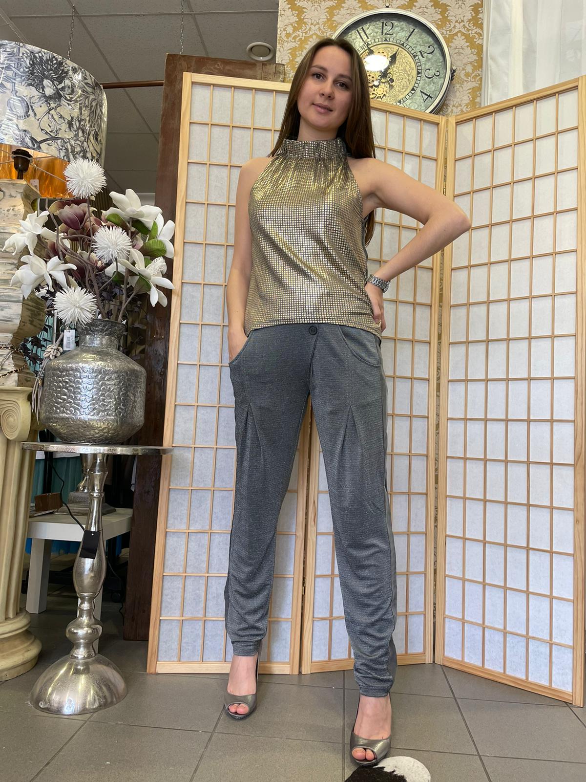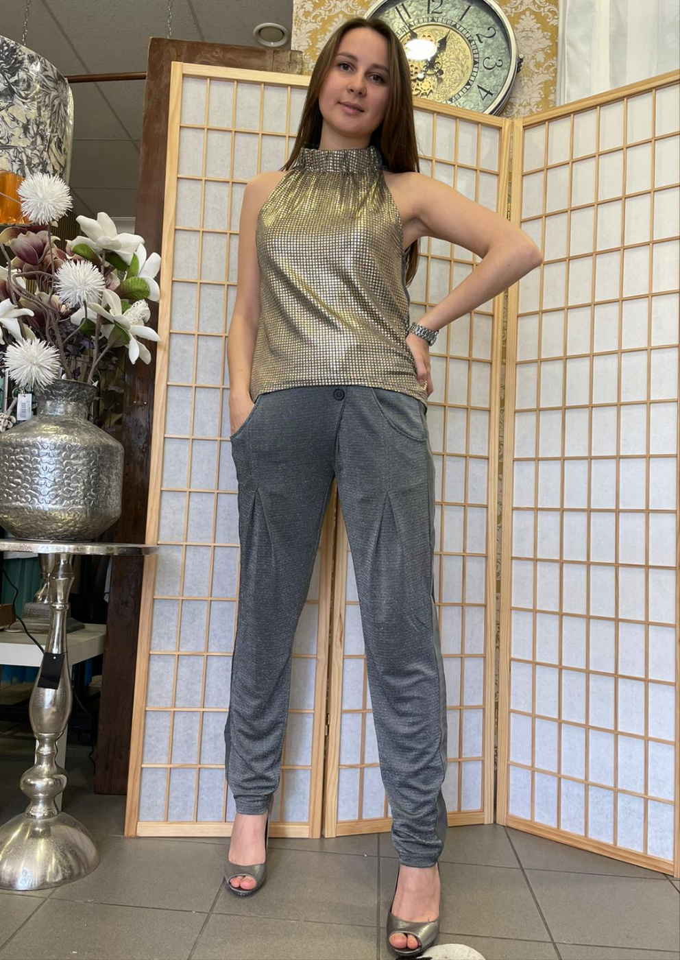 * Kombiniere die Hose mit einem eleganten Oberteil, wie dem glänzenden Top auf dem Foto, für einen schicken Look.