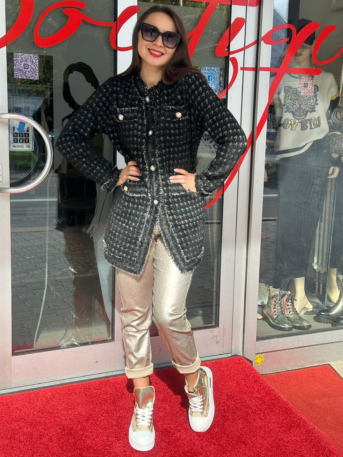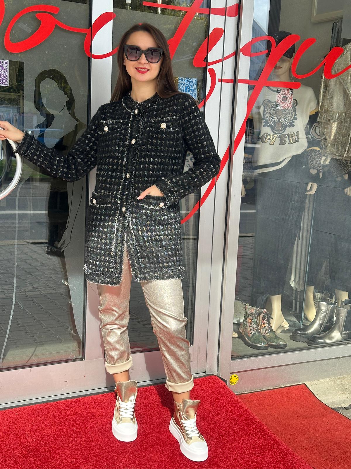 Diese elegante lange Jacke vereint Komfort und Stil auf höchstem Niveau. Mit einem schicken Tweed-Muster und funkelnden Details wird sie garantiert zum Blickfang in Ihrer Garderobe. Perfekt für Größen von 36 bis 40, bietet sie eine optimale Passform für verschiedene Körperformen.