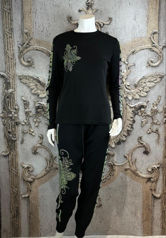 Dieser schwarze Zweiteiler ist ein echter Blickfang! Das Set besteht aus einem langärmligen Oberteil und einer bequemen Hose – beide verziert mit edlen, glitzernden Strasssteinen in floraler und ornamentaler Optik.