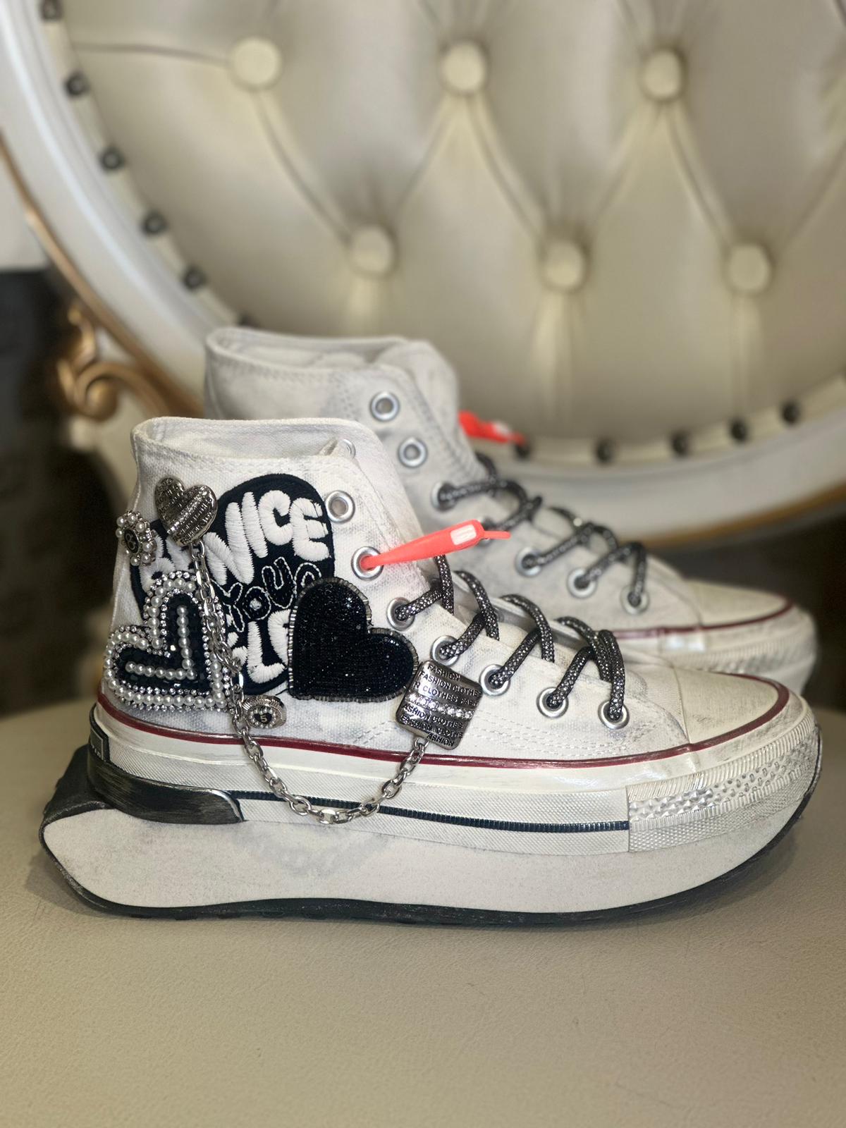 Diese verspielten Sneaker in weiß ist eine perfekte Mischung von Eleganz, Komfort und lässigem Outfit. Mit seinen funkelnden Klitzerelementen ist dieser Sneaker auffällig. Die hohe Plateausohle bietet einen guten Laufkomfort. Verpassen Sie nicht die Gelegenheit, diesen trendigen Sneaker von NAN-KU zu erwerben.