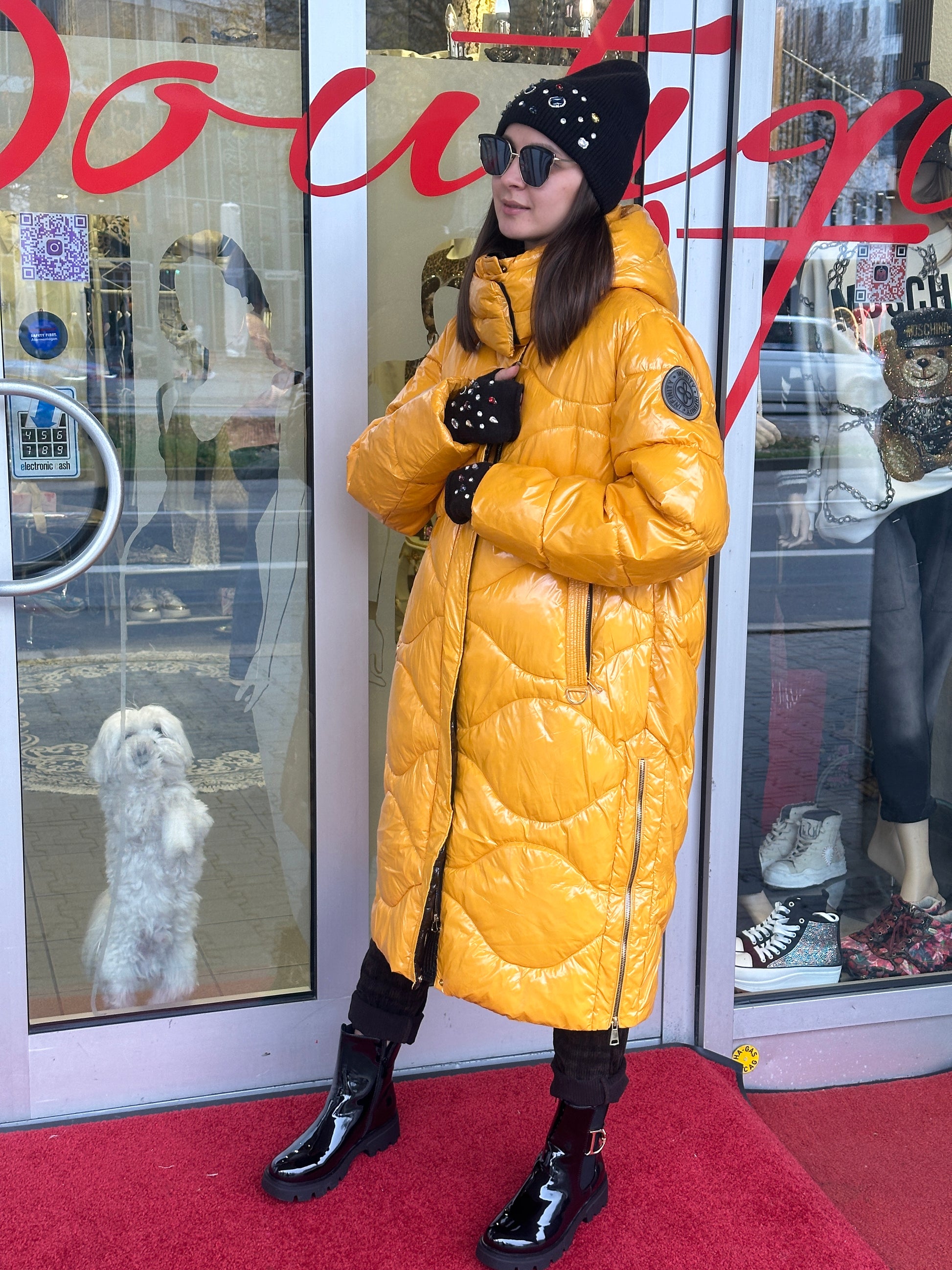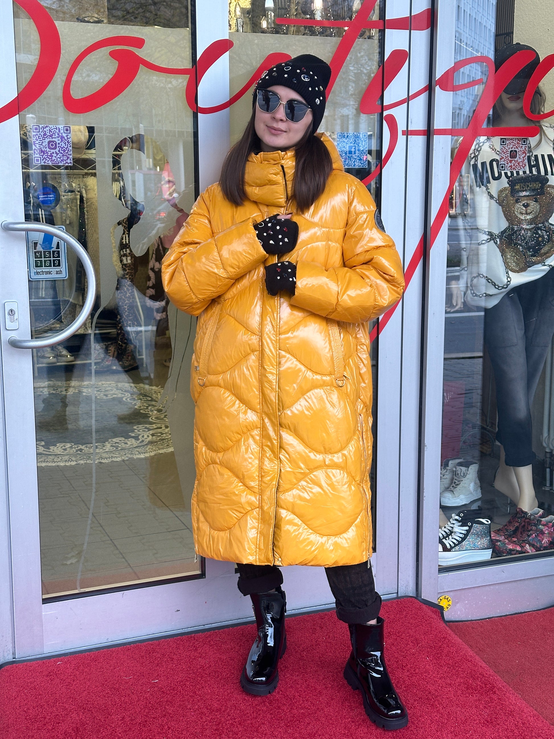 Dieser auffällige Steppmantel in der Trendfarbe Senfgelb ist ein absoluter Blickfang und hält dich an kalten Tagen kuschelig warm. Mit seinem modernen Design und der leuchtenden Farbe ist er ein Must-Have für die kommende Saison.