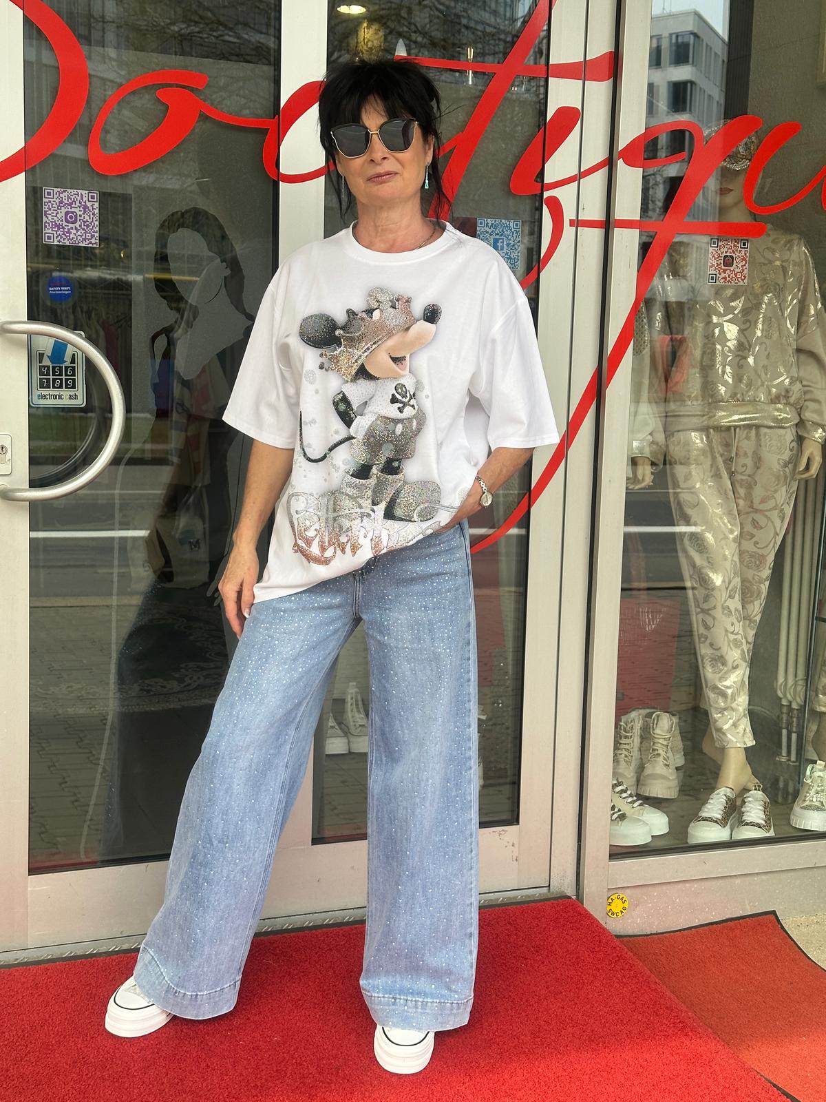 Dieses trendige Oversize-T-Shirt ist ein echter Hingucker und verleiht jedem Outfit eine verspielte Note. Mit seinem auffälligen Comic-Figuren-Print, den funkelnden Glitzerdetails und dem trendigen Used-Look ist es ein Must-Have für die kommende Saison.