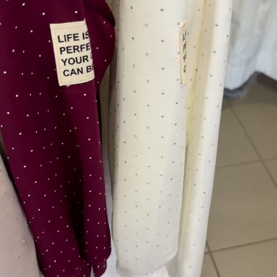 Mach es dir stilvoll bequem! Dieses zweiteilige Loungewear-Set vereint lässigen Komfort mit einem Hauch von Glamour. Der locker geschnittene Pullover und die passende Jogginghose sind mit feinen, funkelnden Strasssteinchen verziert, die dem Outfit das gewisse Etwas verleihen – perfekt für entspannte Tage zu Hause oder stylische Alltagslooks.