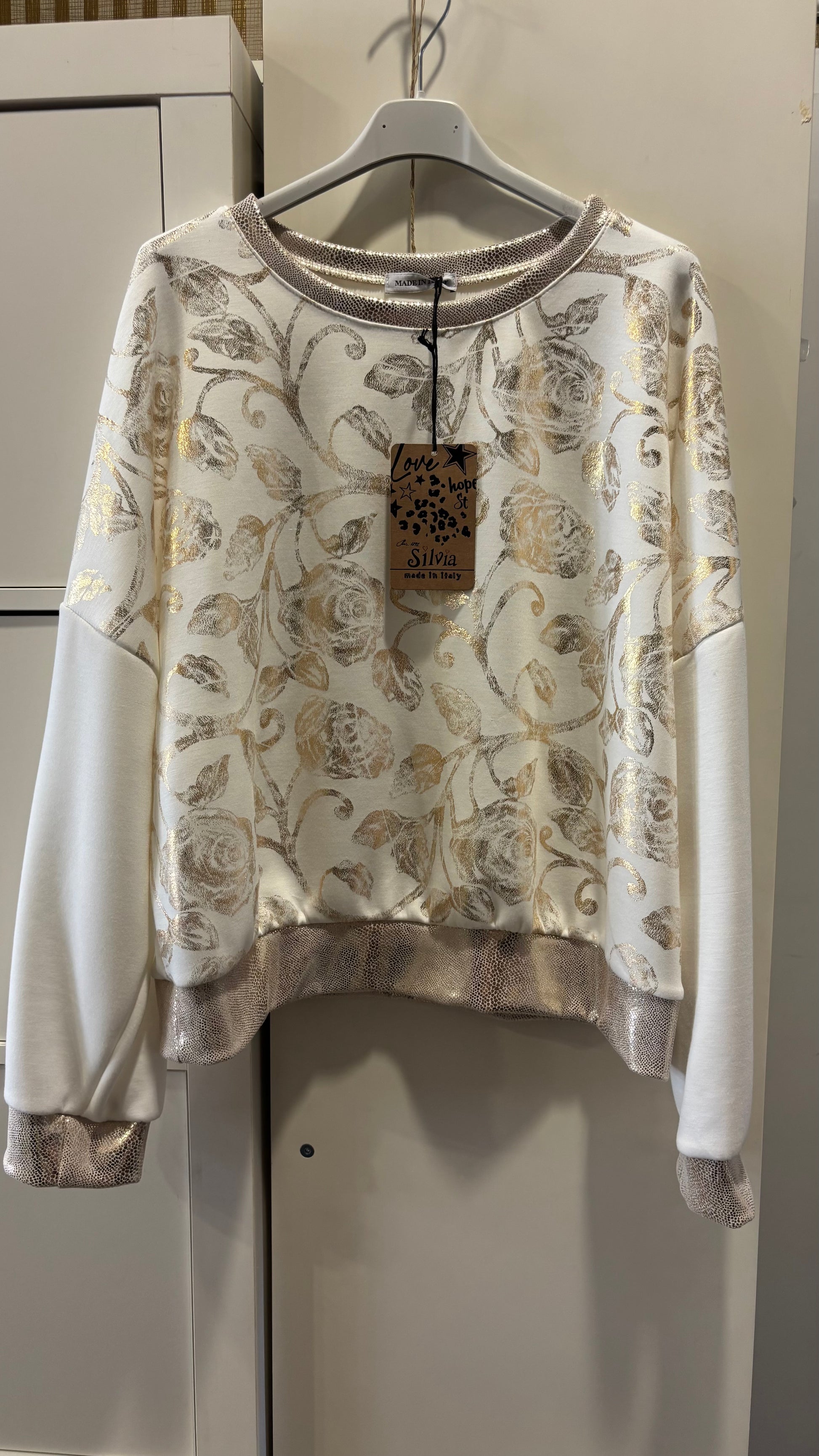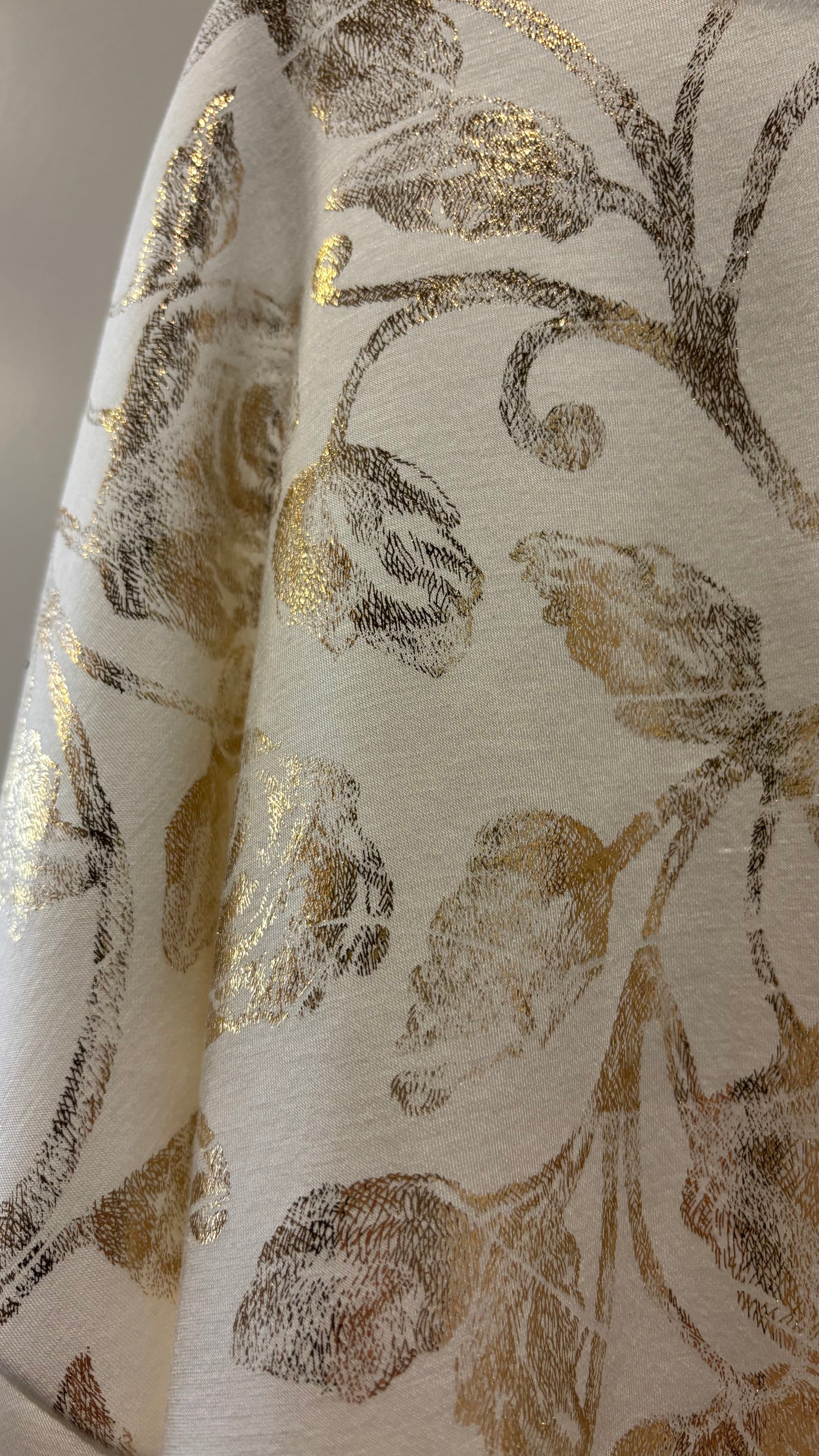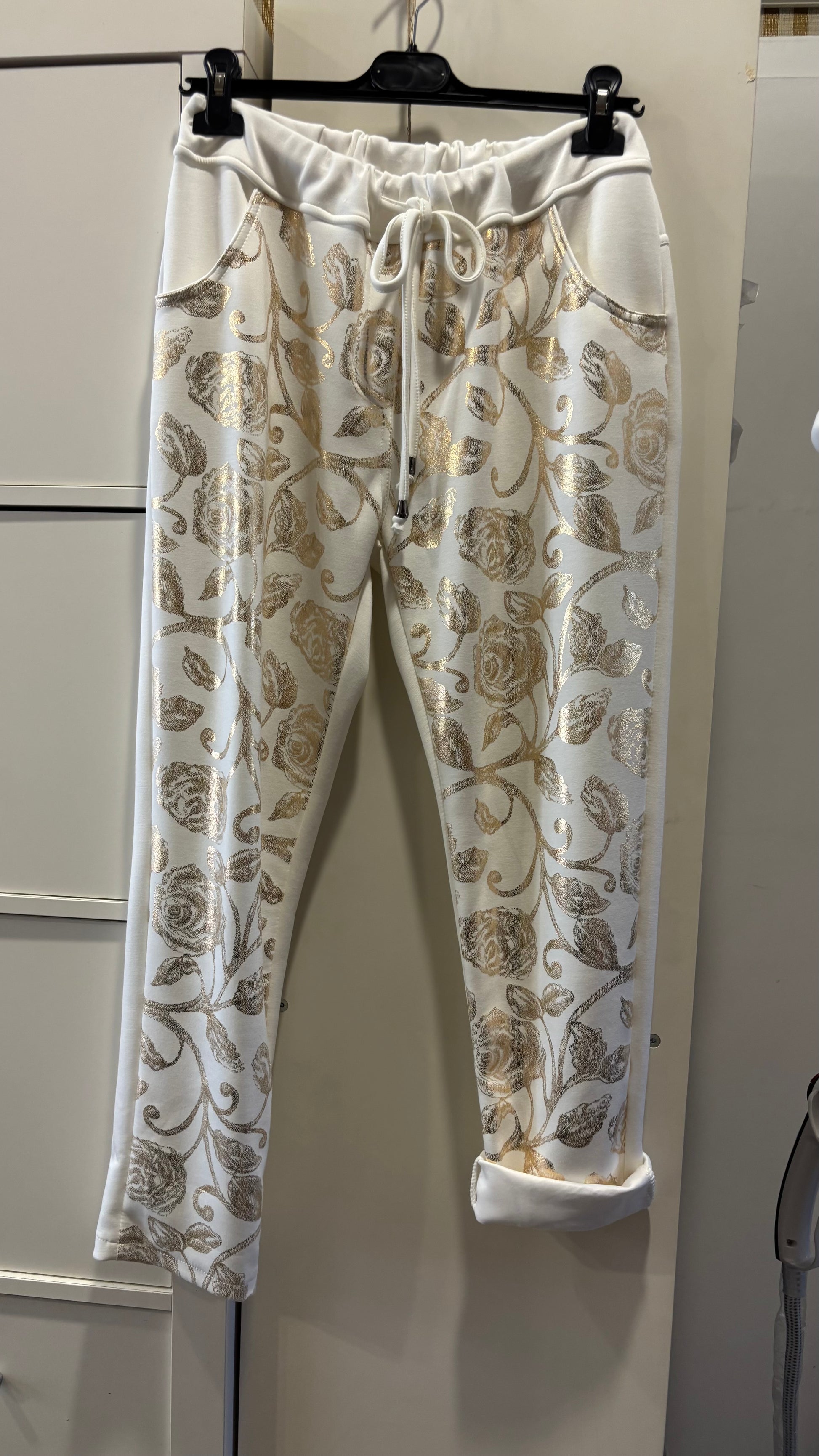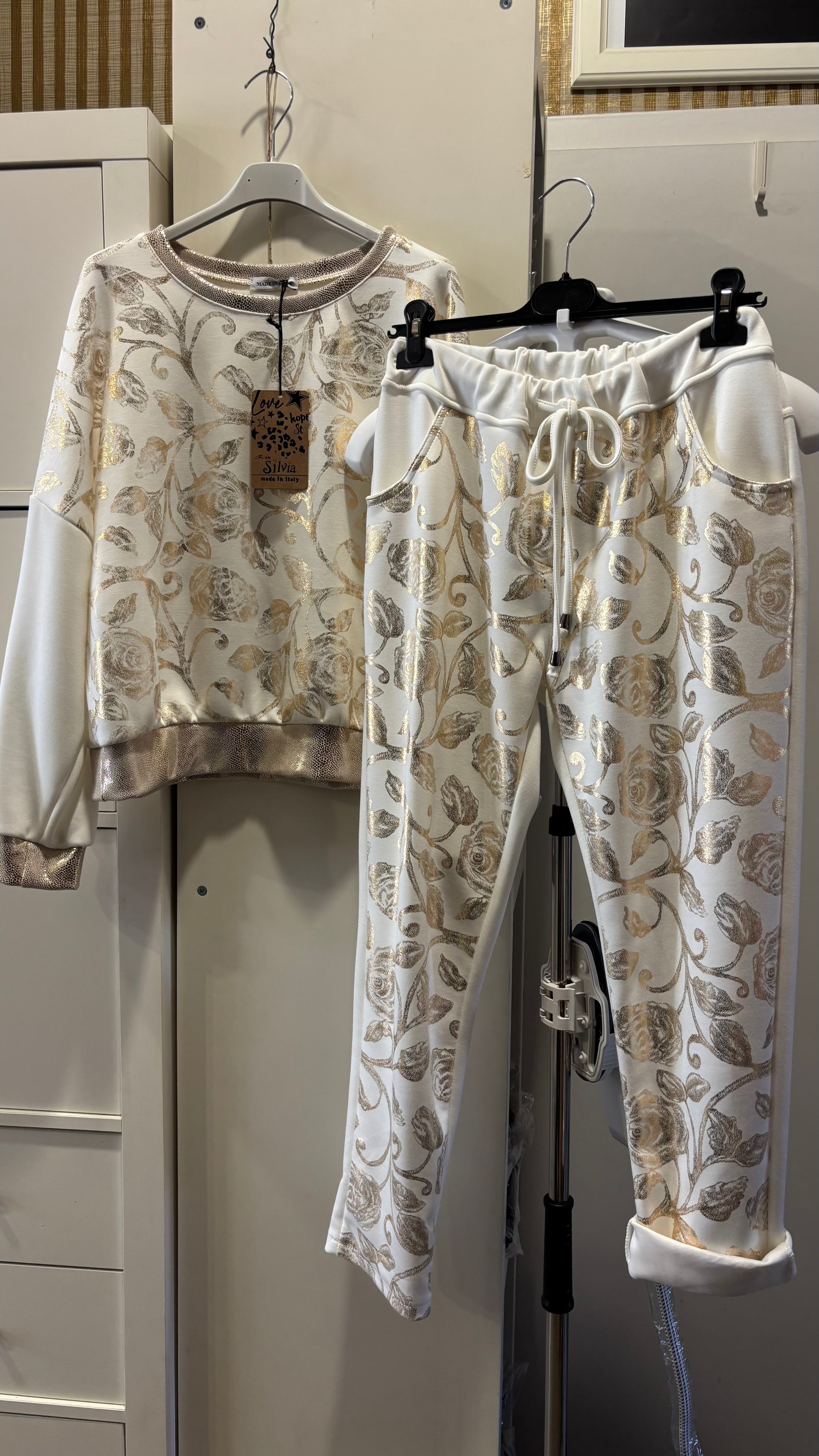 Eleganter Zweiteiler aus weichem Stoff, bestehend aus Pullover und Hose mit edlem, goldschimmerndem Rosenmuster. Bequem, stilvoll und perfekt für einen glamourösen Alltagslook.