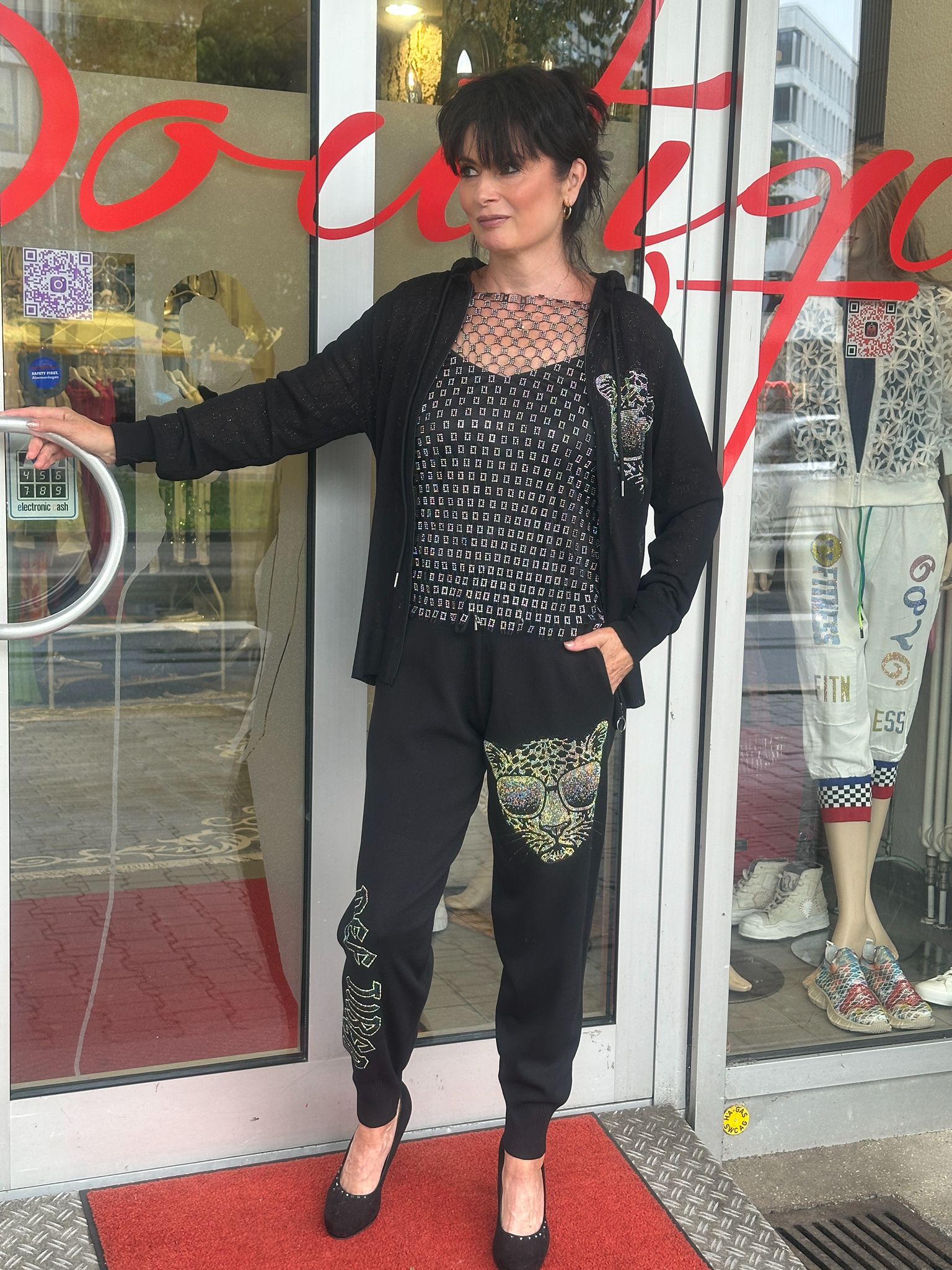 Auffälliger und gleichzeitig bequemer Zweiteiler im angesagten Casual-Look – bestehend aus Kapuzenpulli und Jogpants mit funkelndem Glitzerprint im Leoparden-Design.